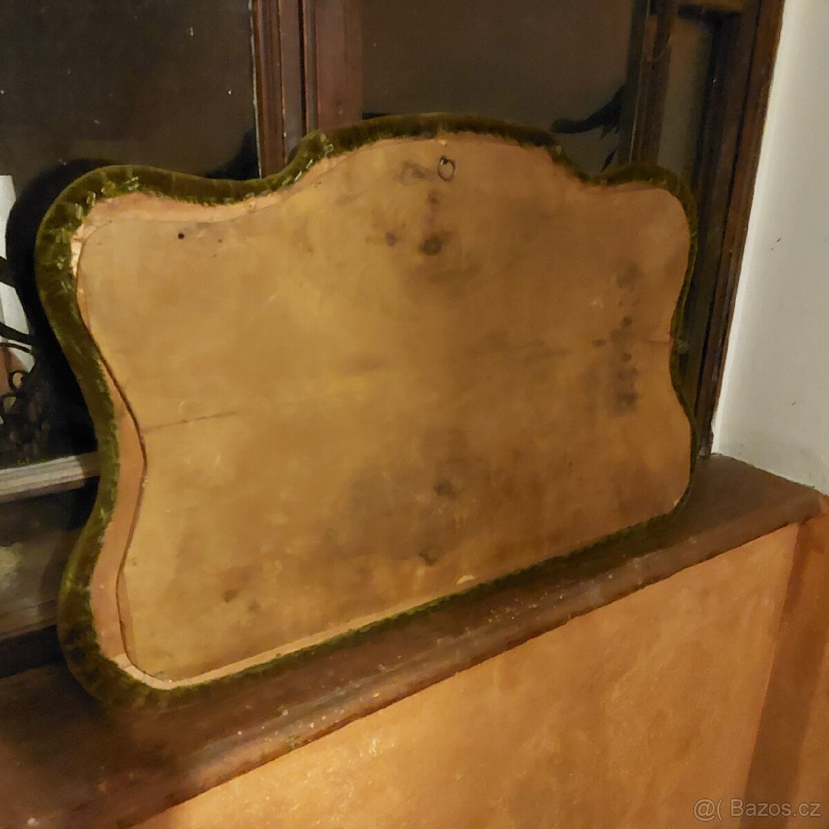 Zajímavé secesni zrcadlo v zeleném sametu s ozdobami,rozmery:77×57cm,preferuji osobní odběr,domluva možná,volejte WhatsApp,SMS,děkuji