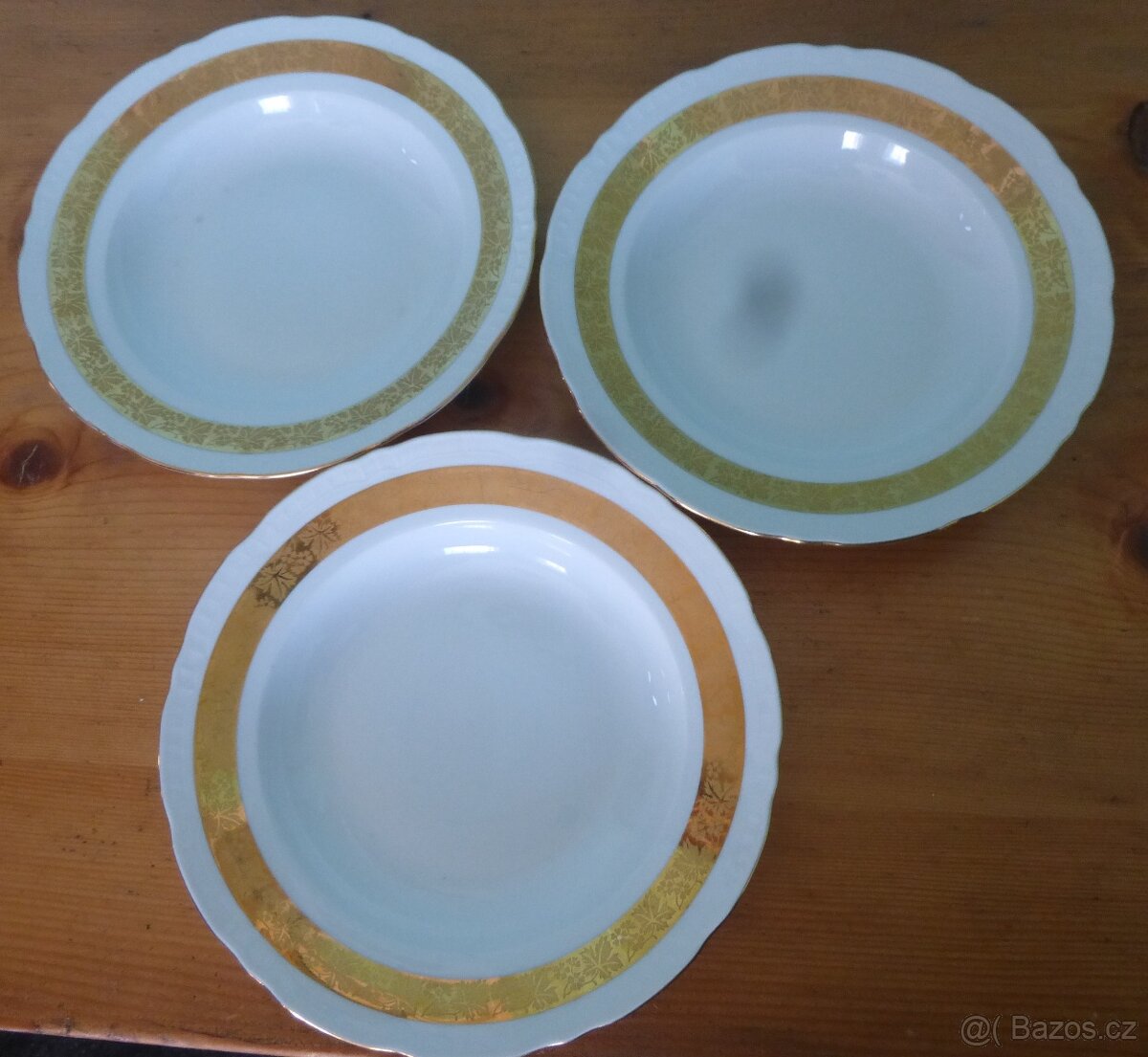 Prodám 3 kusy hlubokých talířů se zlatým pruhem. Bez prasklin a otluků. Tmavý flek je chyba na objektivu fotoaparátu.