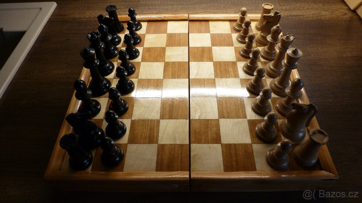 Prodám staré cestovní šachy.Šachovnice je intarsovaná ze dvou druhů dřeva. Krásné šachy, figury plastové.