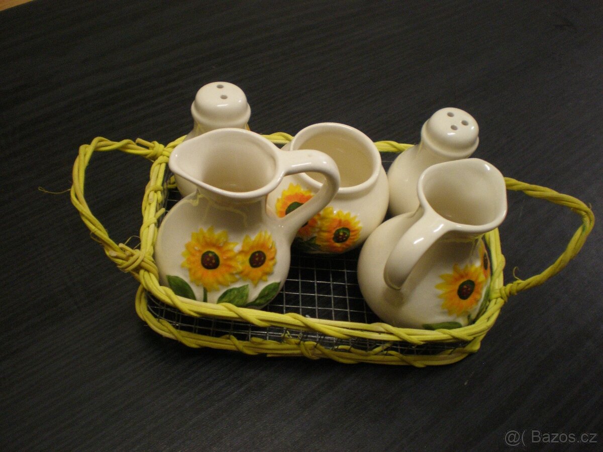 5 kusů keramických kořenek na proutěném podnosu. Slunečnicová ozdoba jídelního stolu. Při koupi dvou položek z mé nabídky získáte na tu dražší 10% slevu.