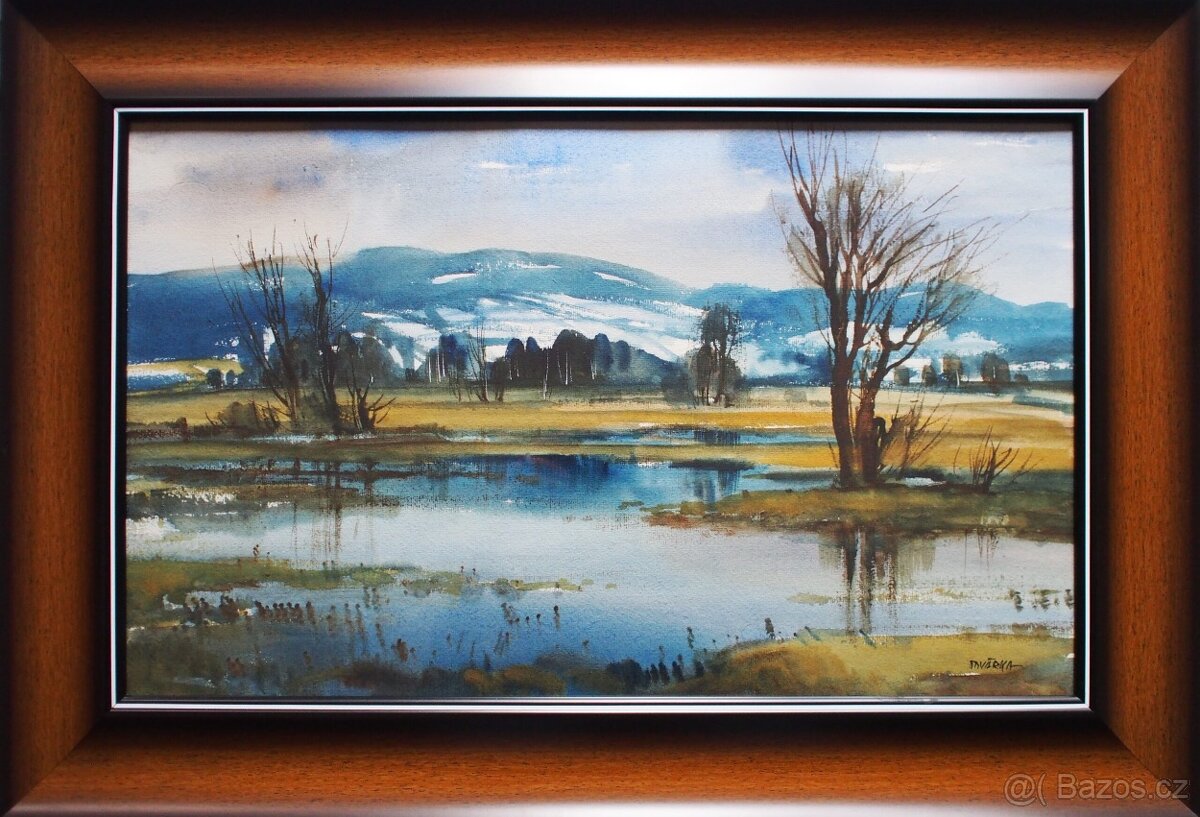 Obraz velký akvarel Jan Odvárka 1980 Náves s rybníkem - [22.4. 2026]
