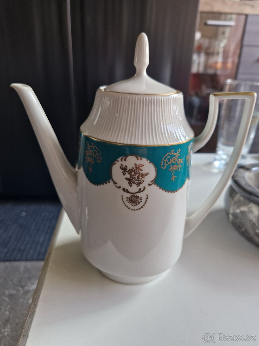 Souprava na kávu - Dubí - [26.3. 2026]Souprava na kávu, obsahující 1 konvičku na kávu, 6 šálků a 6 podšálků, 1 cukřenku a 1 konvičku na mléko. Vyrobeno porcelánkou Dubí. Souprava je zdobena zeleným dekorem doplněný o dekor zlatý.