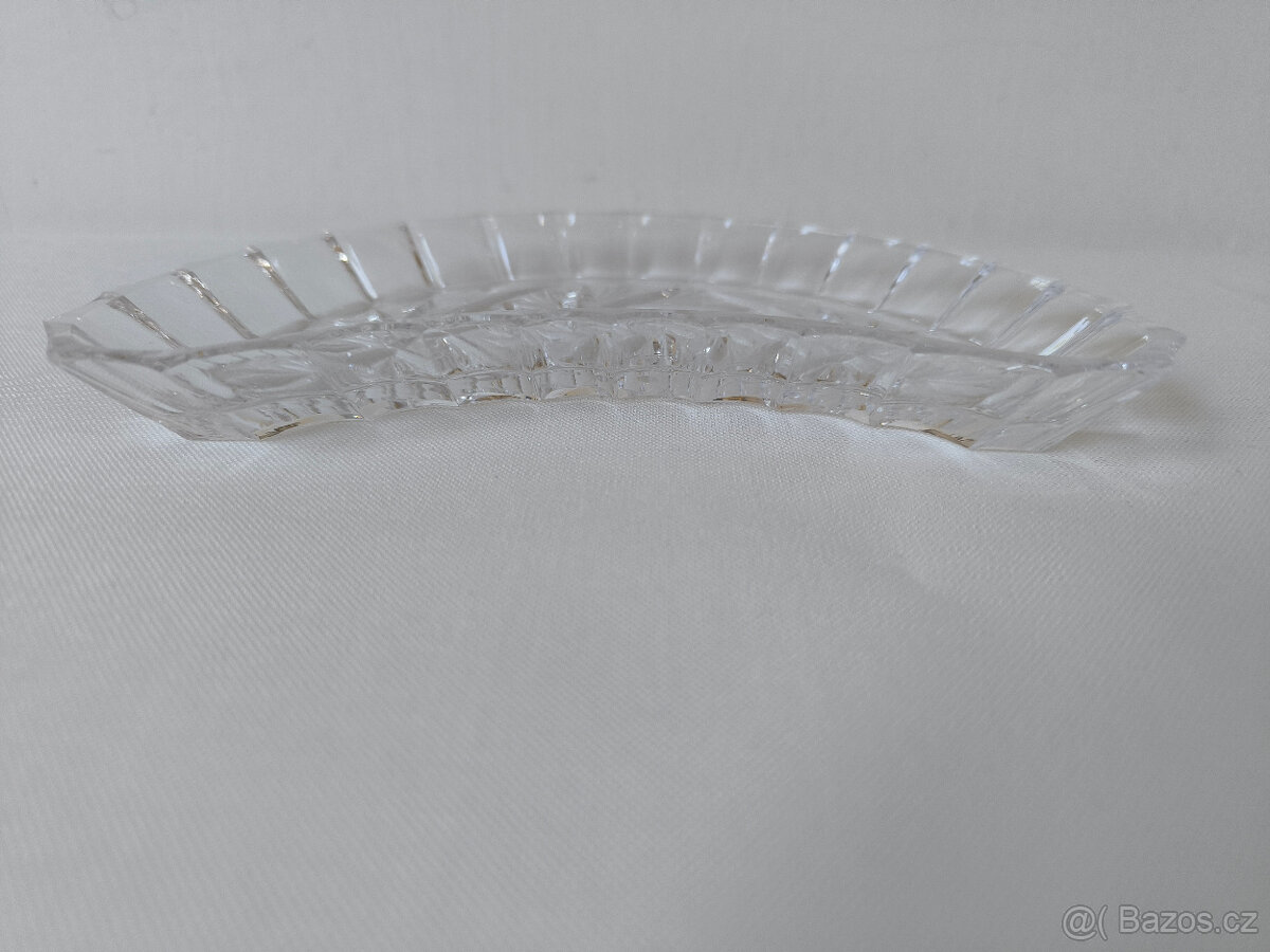 Miska ve tvaru měsíce průhl. brouš. délka 20cm, šířka 10cm, výška misky 2cm, tl.skla 0,5cm