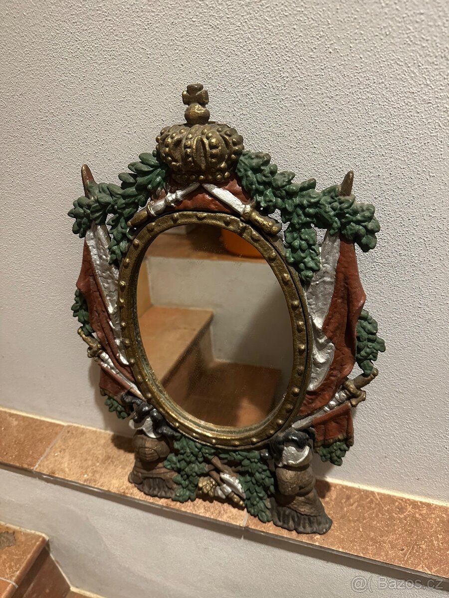 Starožitné zrcadlo. - [21.4. 2026]Prodám starožitné zrcadlo v dřevěném vyřezávaném rámu 70x48. Poškozené v levém horním rohu. Ulomený kus viz foto.