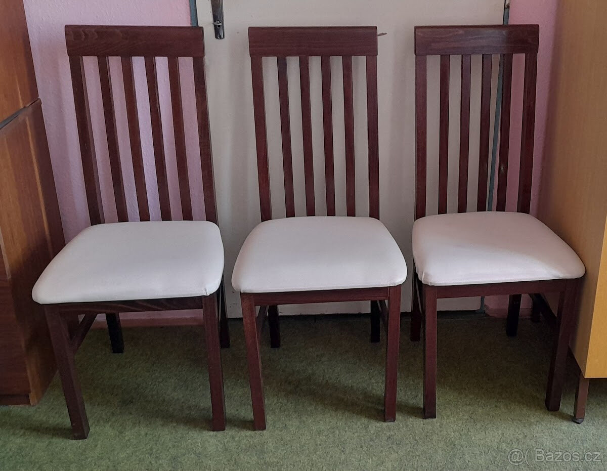 Nabízím zánovní tmavé židle s čalouněným sedákem, 3 kusy, model 761, výška 97cm, sedák 40x40, zúžení k opěradlu na 35cm, sedák od země 45cm, cena za všechny 2500 Kč.