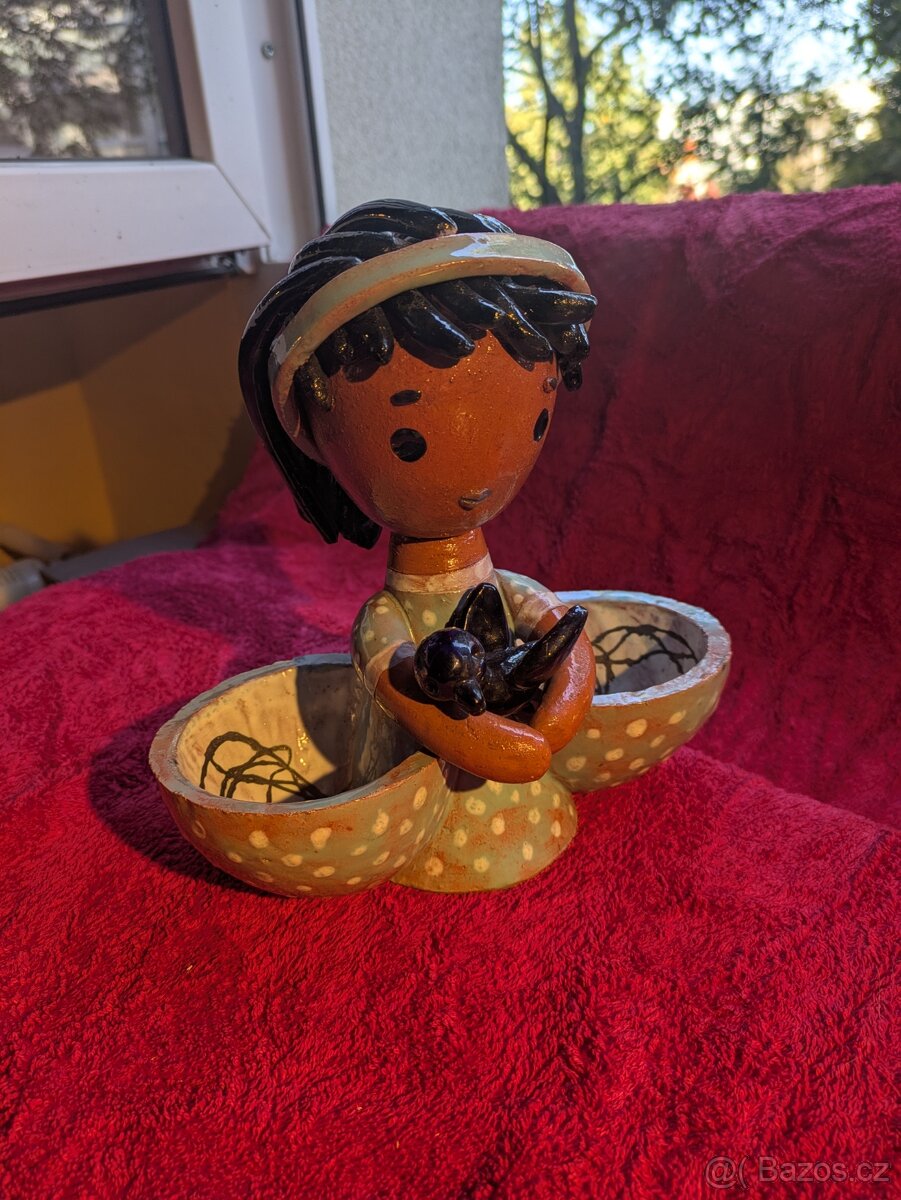 Nabízím k prodeji keramickou panenku s košíčky, výška 19 cm, šířka 19 cm, bez poškozeni