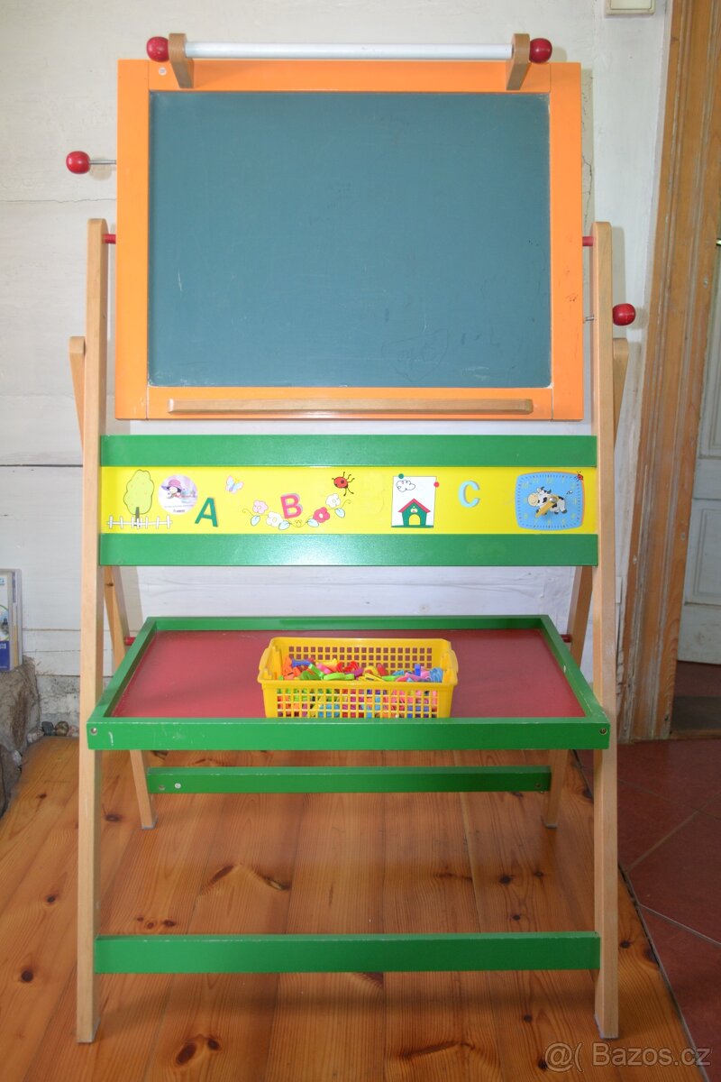 Nabízím dětskou tabuli, z jedné strany na křídy, ze druhé na magnet. Mam i magnetická písmenka a čísla, používaná jako dekorace.