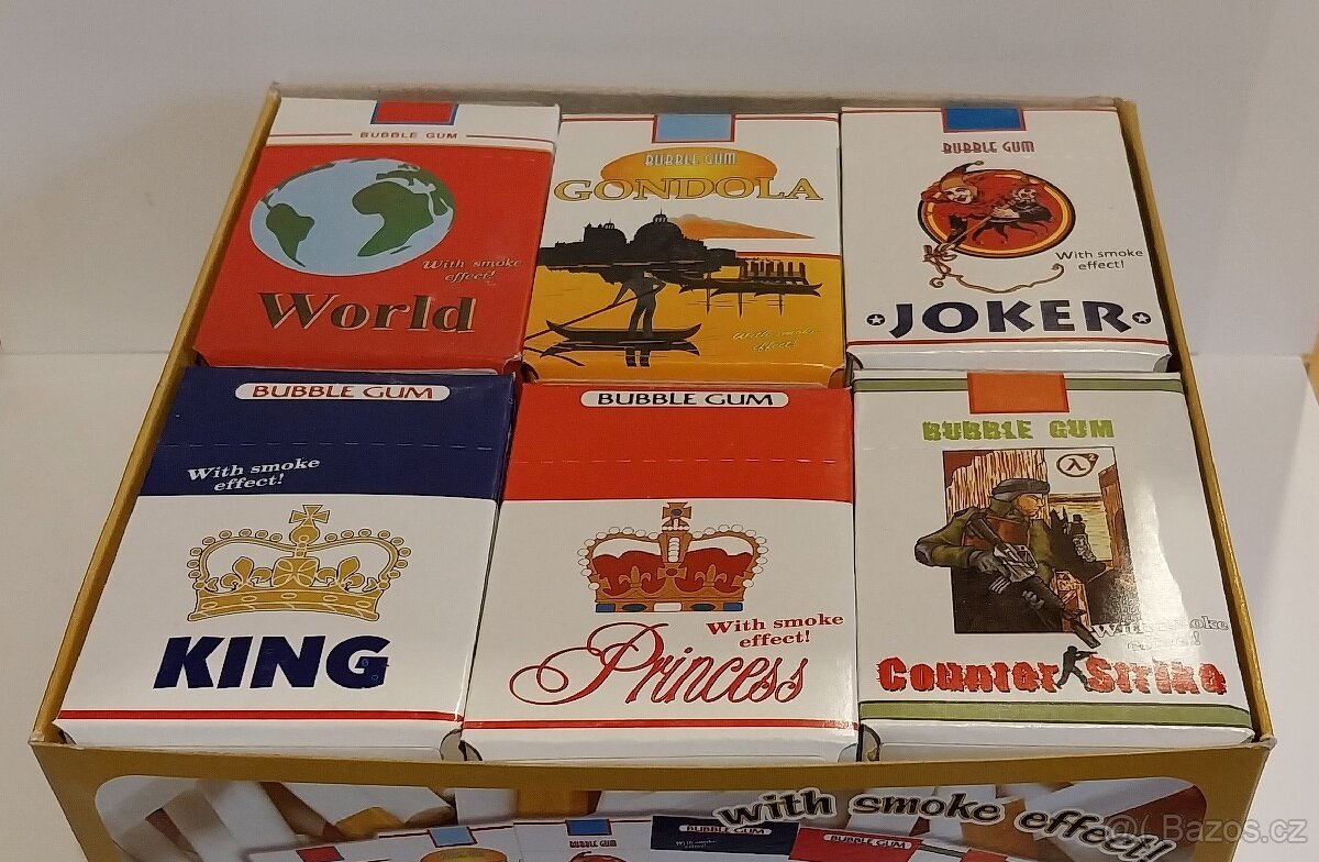 NOSTALGICKÉ ŽVÝKAČKY VE TVARU CIGARETY, KRABIČKA OBSAHUJE 10 ŽVÝKAČEK A V BALÍKU JE 18 KRABIČEK. PRODEJ PO CELEM BALENI ZA 250,-