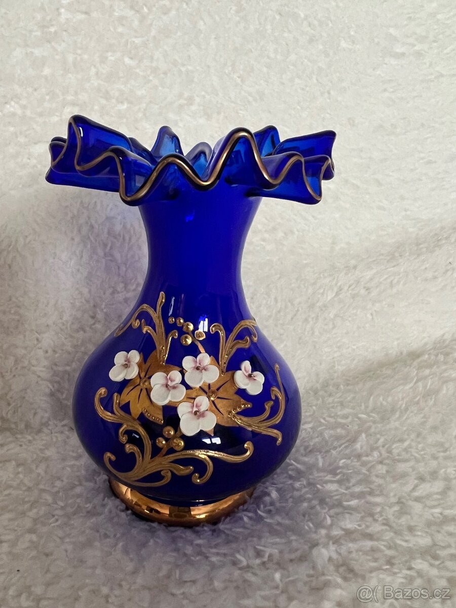 Prodám českou ručně malovanou vázu z kobaltového skla, zlatě zdobena s květinovým motivem. Sklárna Nový Bor. Po domluvě možné převzetí v Praze.