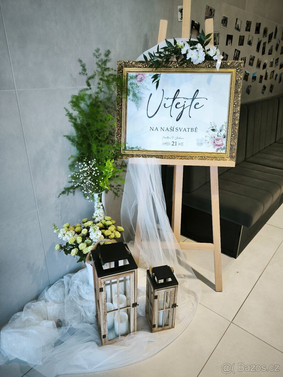 Prodám uvítací ceduli - malířský stojan + starožitný obrazový rám. Prodej pouze dohromady. Použití svatba, narozeniny, party, přehlídka, výstava.