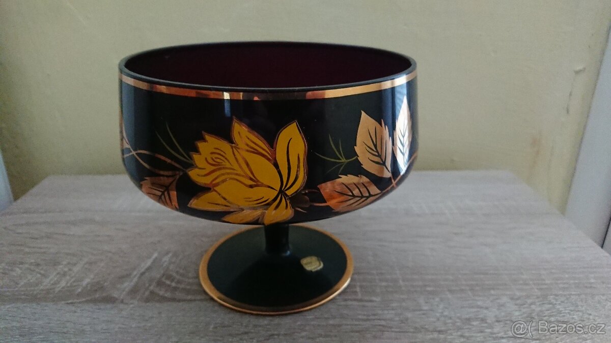 Prodám mísu na nožičce z modrého skla zdobenou zlatými květy a lístky. Výška 14,5cm, průměr vršku 16,5cm, průměr spodku 11cm. Osobní předání Praha nebo Louny. Poštou zasílám při platbě předem