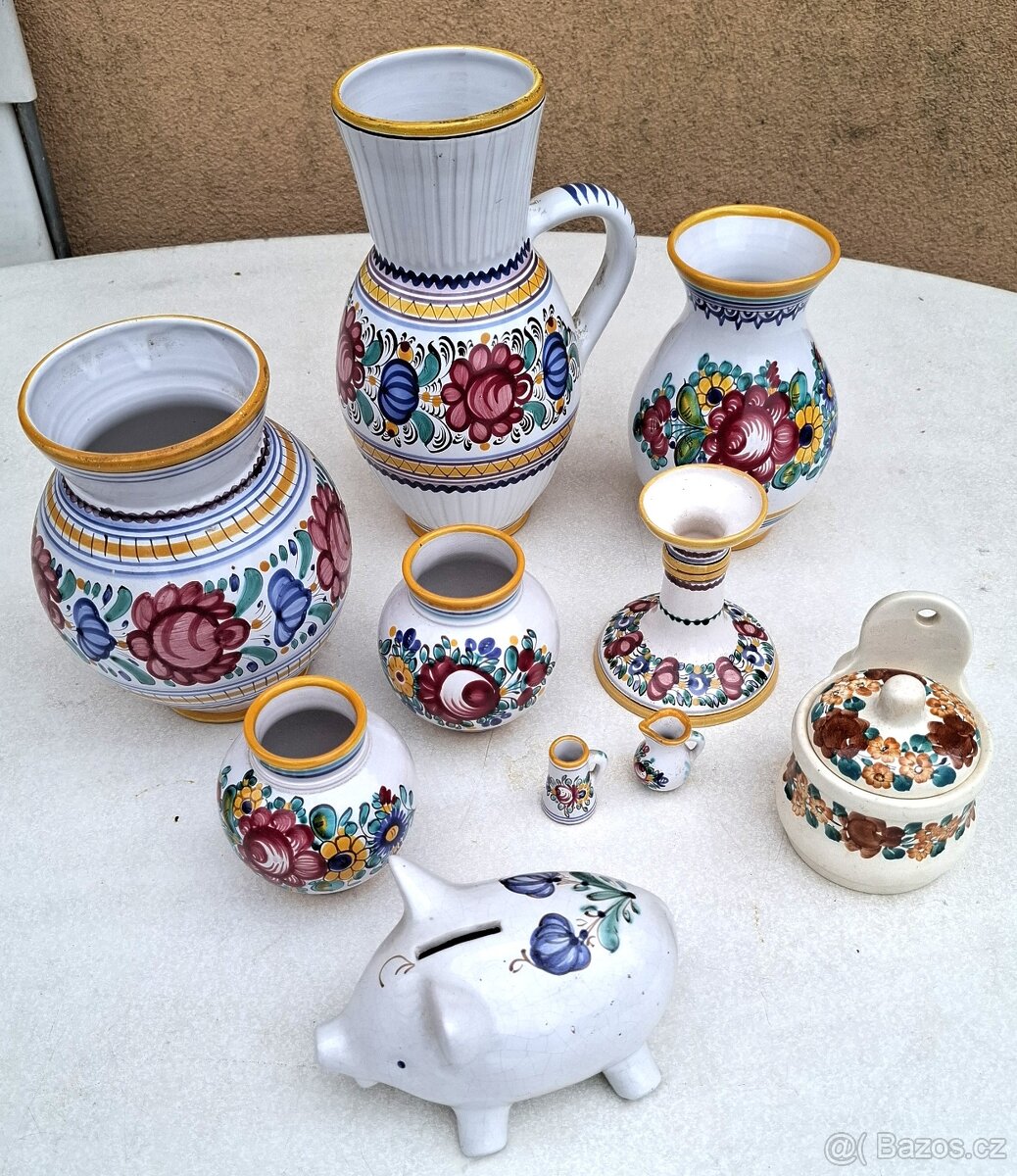 Na prodej lidová Modranská keramika, celkem 9 ks (1 džbán, 4 vázy, 1 svícen, 2 miniatury džbán, 1 pokladnička prasátko). Přidám keramickou slánku s víčkem.