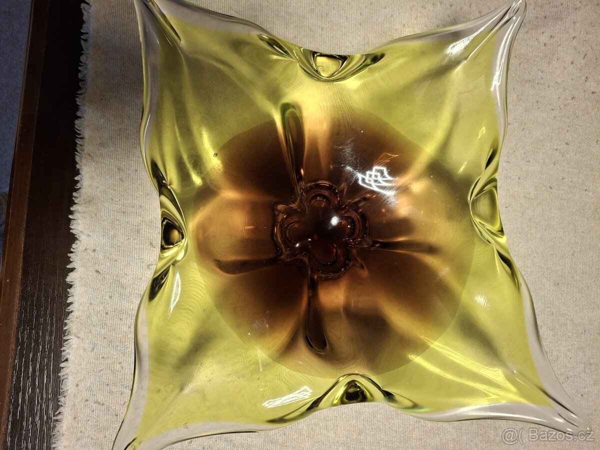 Čtvercová mísa, hutní sklo, Josef Hospodka - [20.4. 2026]Prodám čtvercovou mísu (možná je to nástolec) z hutního skla, autor Josef Hospodka. Rozměry cca 28x28 cm, výška cca 10 cm. Poškození: nesmyvatelná barva, tečkovaný flek délky 5 cm (nafoceno).