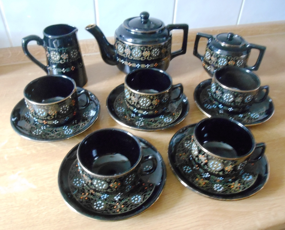 Prodám prvorepublikový čajový servis černé barvy s barevnými tečkami, cena dohodou, pouze osobní převzetí.