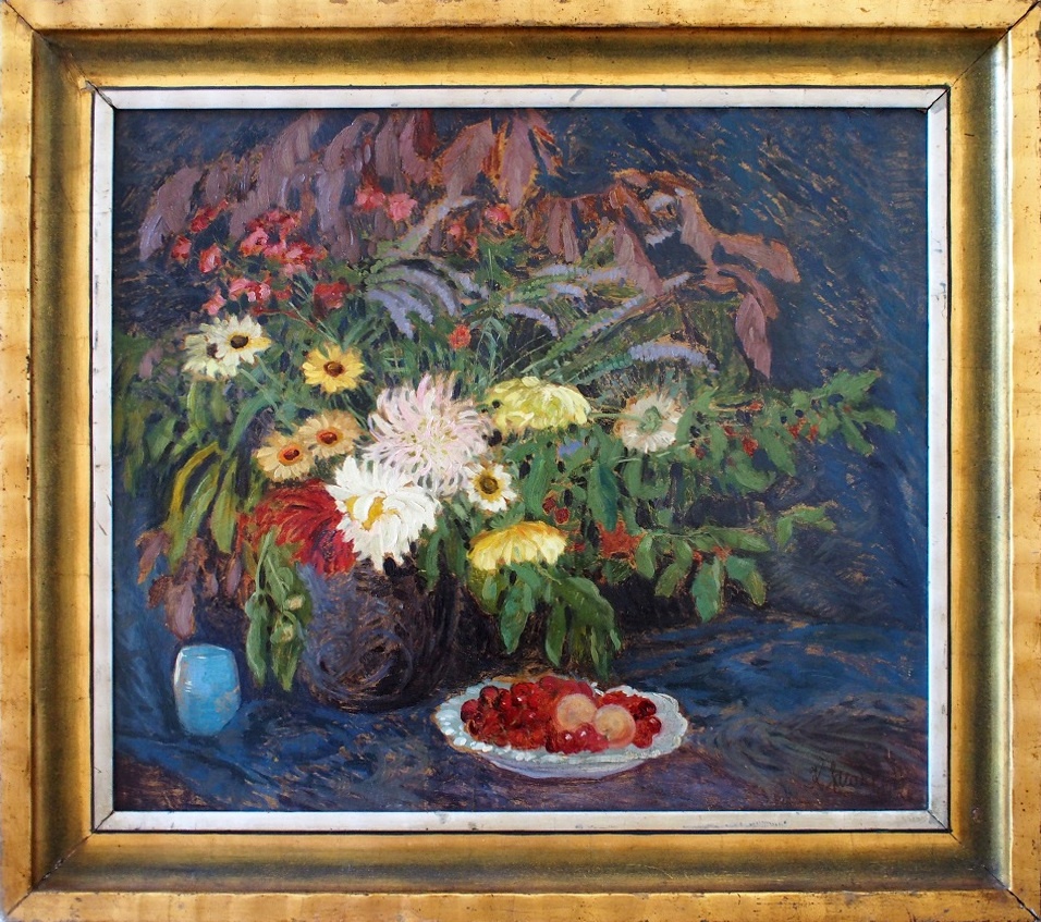 Zátiší s kyticí, olejomalba na kartonu o rozměrech 70×80 cm, s rámem 88×98 cm, signováno.