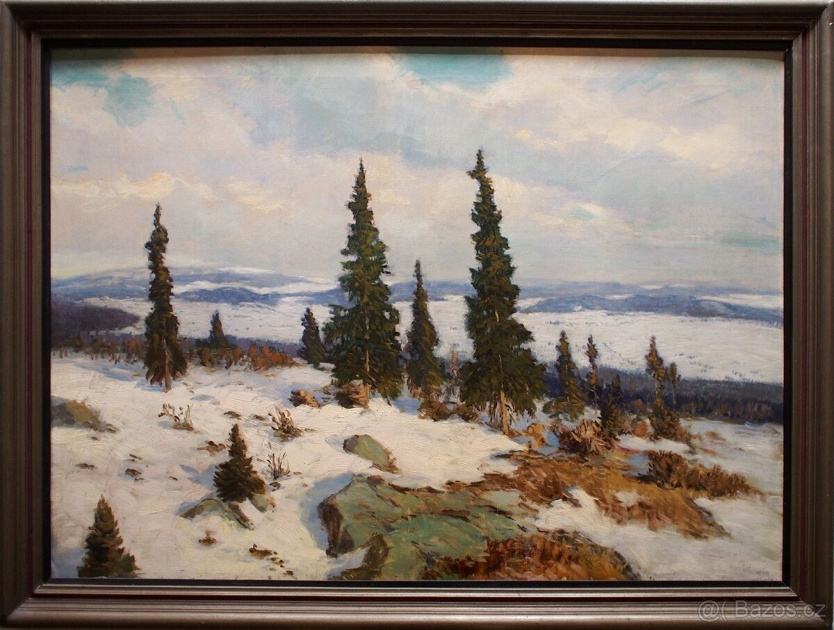 Zimní krajina, olejomalba na plátně o rozměrech 96×131 cm, s rámem 111×146 cm, signováno.