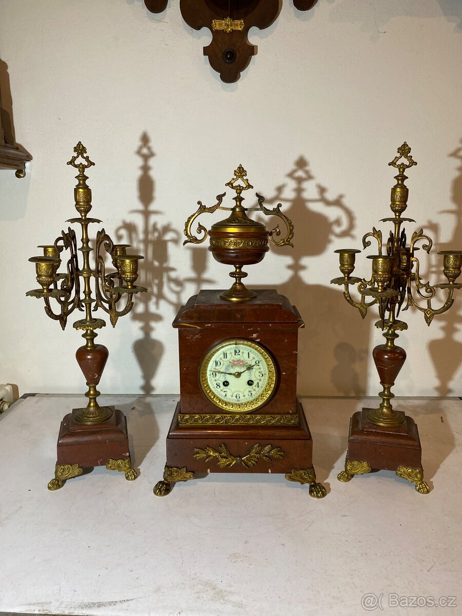 Starožitné krbové hodiny - [16.4. 2026]Starožitné mramorové krbové hodiny doplněné bronzovými aplikami, kombinace dvoubarevného mramoru, černý mramor doplněn zlatými malbami v brusu, smaltovaný intaktní ciferník, půlové bití na zvonek, okolo roku 1890