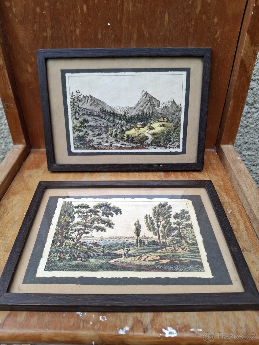 Prodám starožitnosti. Pět obrázků z osmnáctého století. Velikost 18x15cm.