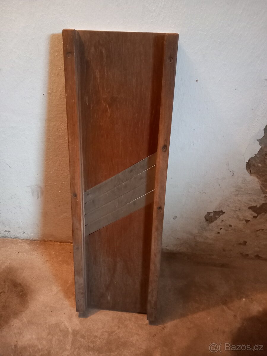 Nabízím starou mandolínu na krouhání zelí. Teoreticky stále funkční, dřevo zachovalé, nože ostré. Rozměry 97 x 30 cm. Bohužel bez kloboučku.