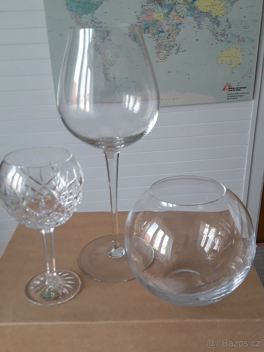 Prodám Obří číši Rona - výška 34 cm, kulovou vázu - průměr cca 17,5 cm a číši na víno. Jen komplet za 590 Kč.