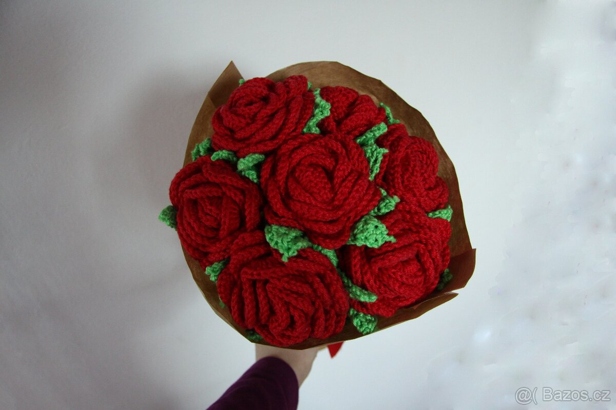 Háčkovaný pugét růží je tvořen sedmi růžemi červené barvy. Vhodné jako dárek pro přítelkyni, kamarádku, maminku, babičku nebo ségru. Průměr pugétu je 20 cm a výška je 35 cm. Růže jsou připevněné na špejli obmotané světle zelenou vlnou. Růže jsou zabalené v balícím papíru hnědé barvy a zavázané červenou saténovou stuhou.