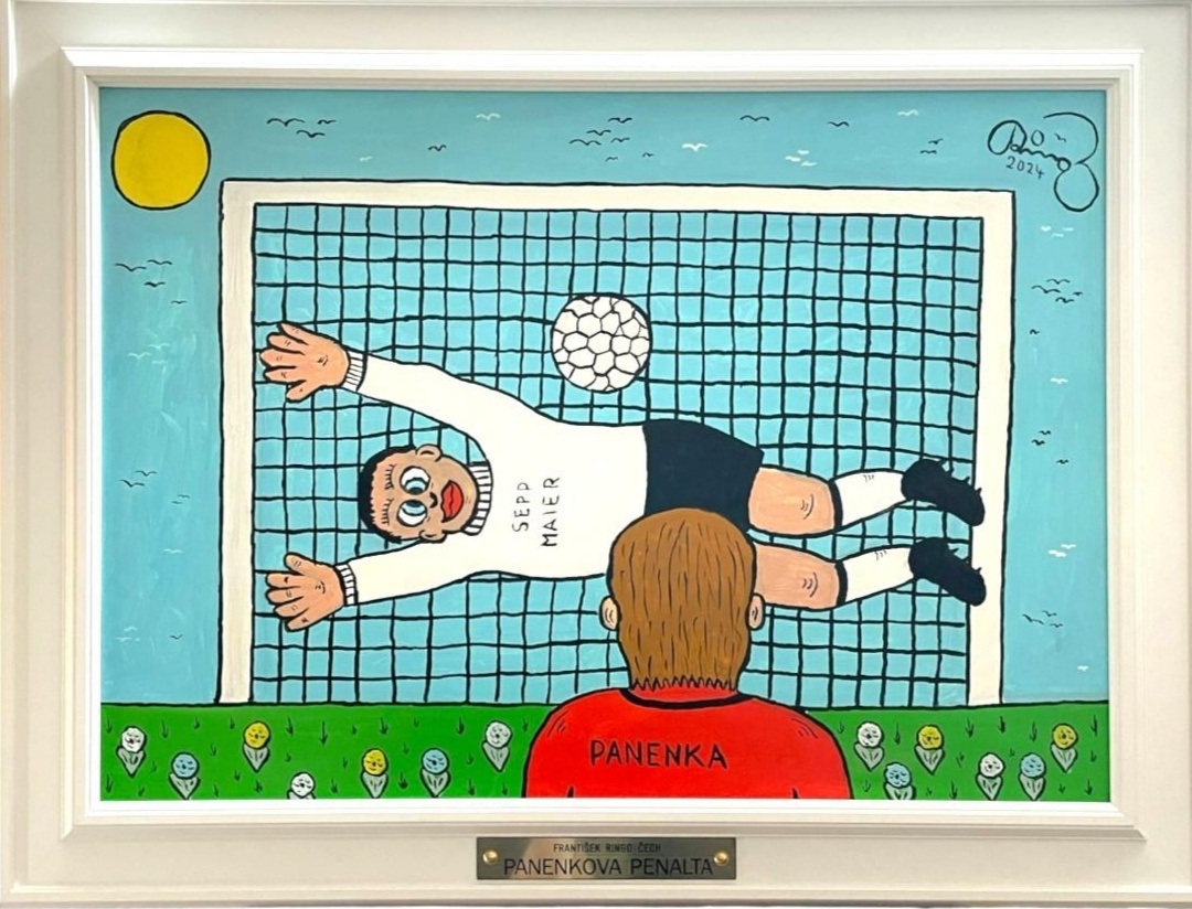 Prodám ze sbírky obraz od Františka Ringo Čecha - Panenkova penalta. Olej na plátně, velikost malby bez rámu 70x50cm