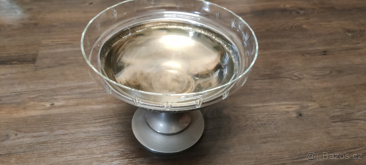 Prodám mísu - alpaka - broušené sklo - viz. foto - průměr skleněné mísy 27 cm