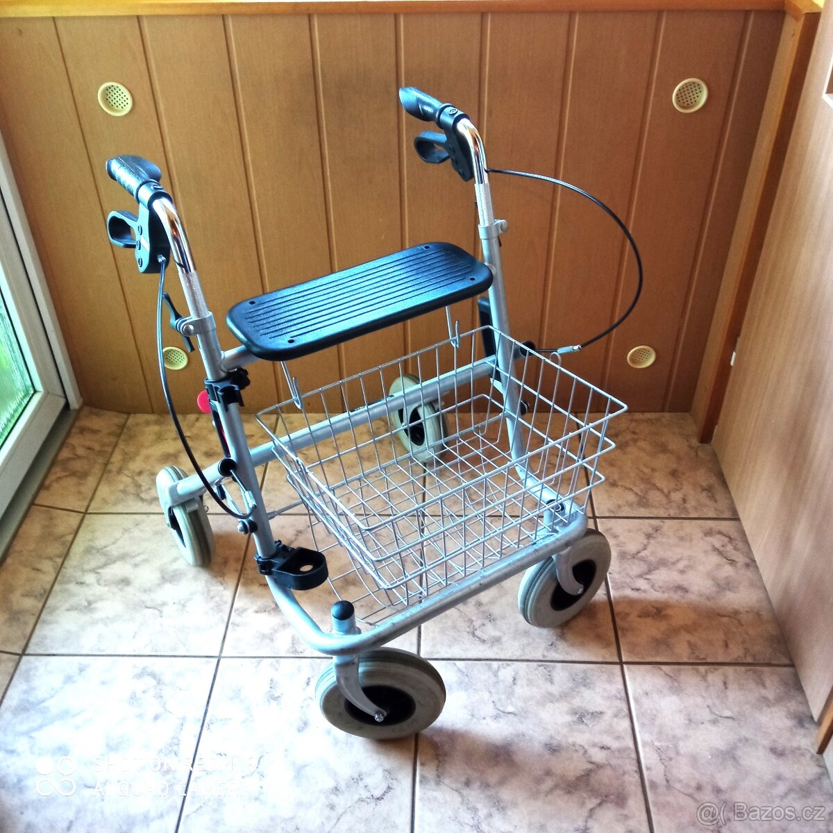 chodítko pro seniory, pojízdné, skládací - [28.4. 2026]Pojízdné chodítko pro seniory. Dá se lehce složit. Kola jsou z plné gumy, brzdy bovdenové. Pěkný stav.