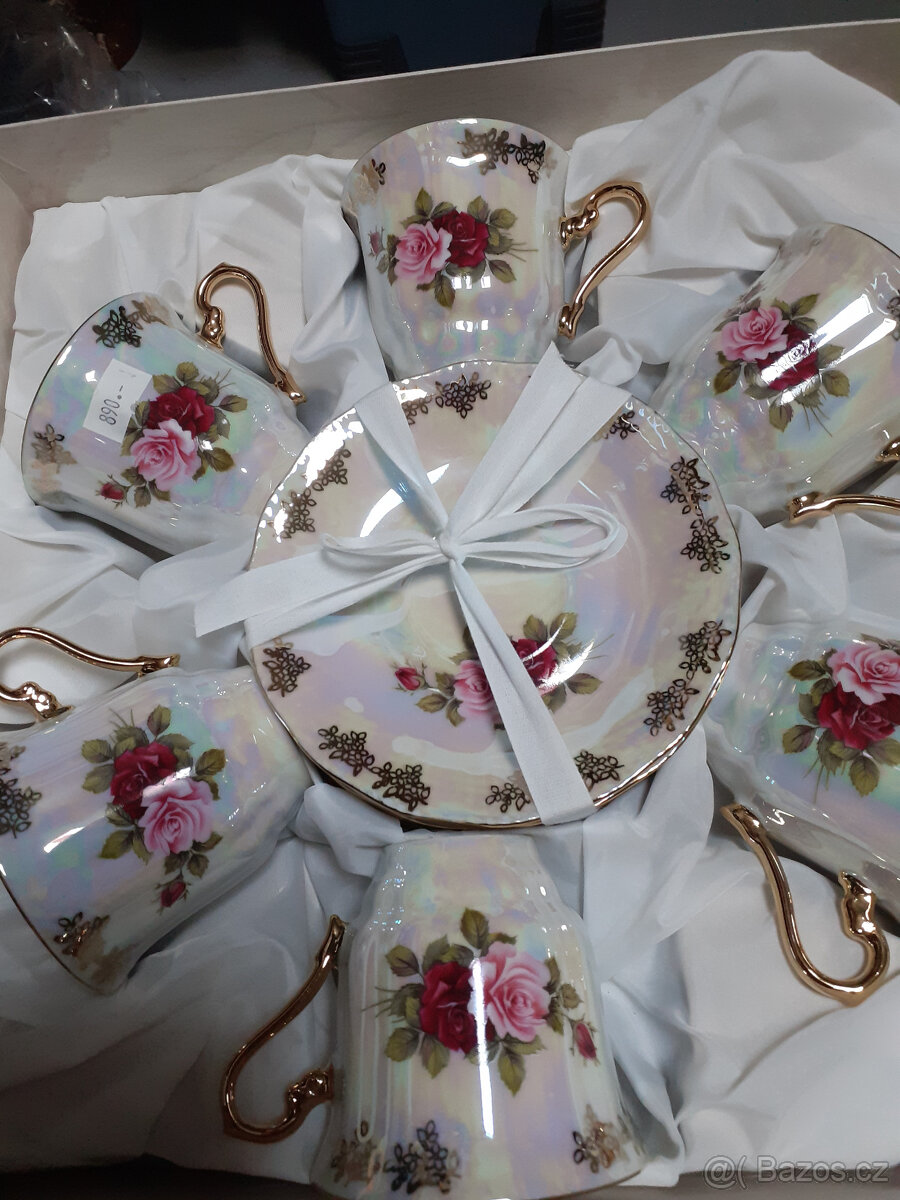 Sada je nová, nikdy použitá - nevhodný dárek. Na jednom podšálku je zlatý okraj lehce ...