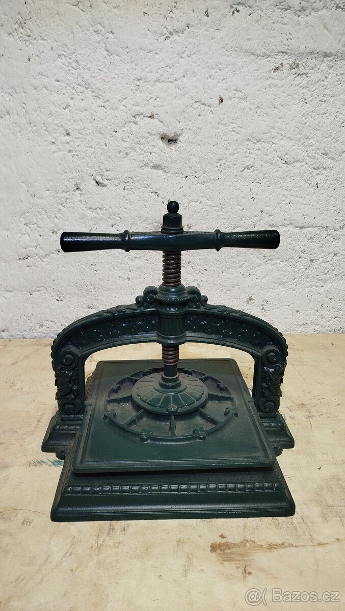 Prodám starožitný, litinový knihařský lis. Zdobený litinový lis na knihy. Nejlépe osobní převzetí. Inzerát platí do smazání.
