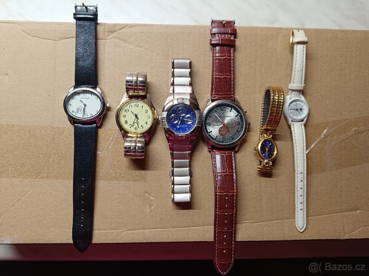 Prodám hodinky ty 4 z kraje jsou pánské ty pozlacené jsou dámské a s bílým jsou dětské.