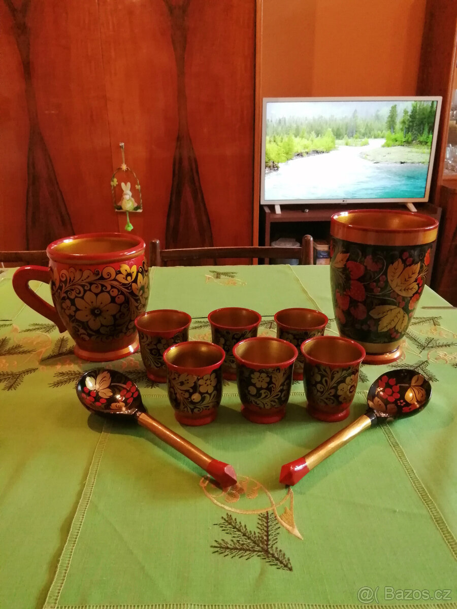Prodám soupravu - pohár, 6 pohárků, váza a 2 lžice.